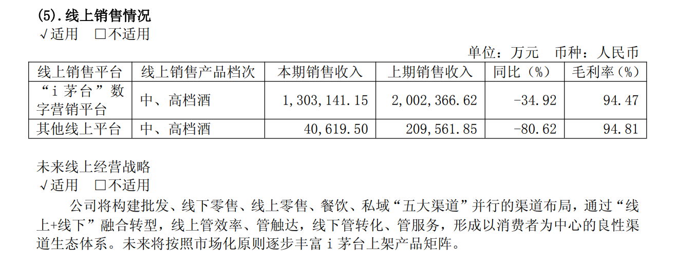 其中,线上销售平台中,通过“i茅台”数字营销平台实现销售收.31亿元,同比下.92%。其他线上平台销售收.06亿元,同比下.62%。据记者计算,“i茅台”贡献的收入占到了直营渠道.41%,年.75%明显下滑。财报还提到,未来将按照市场化原则逐步丰富i茅台上架产品矩阵。