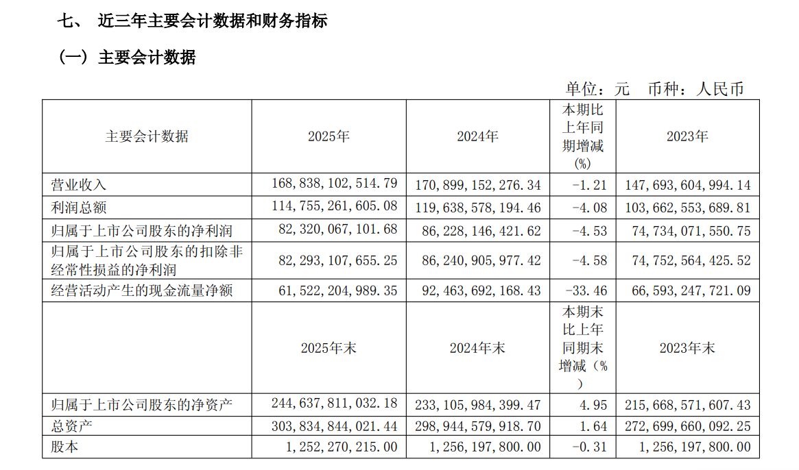 财报显示,2023年、2024年、2025年度公司现金分红总额分别.87亿元、646.72亿元、650.33亿元,占归母净利润的比例依次%、75%、79%。